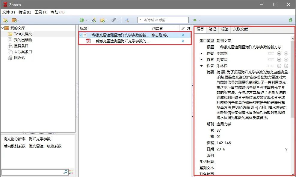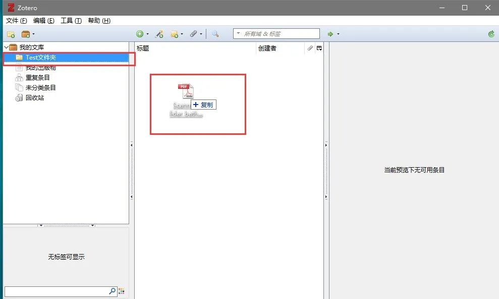 5. 将PDF文件鼠标拖至刚导入文件成为其子文件→完成中文文献的信息抓取