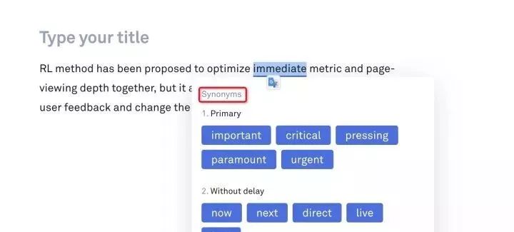除了语法纠错之外,还有同意替换功能,我的塑料英语能想到的词汇都太过常见,不够精准(逼格不足),选中词就可以同义替换了。