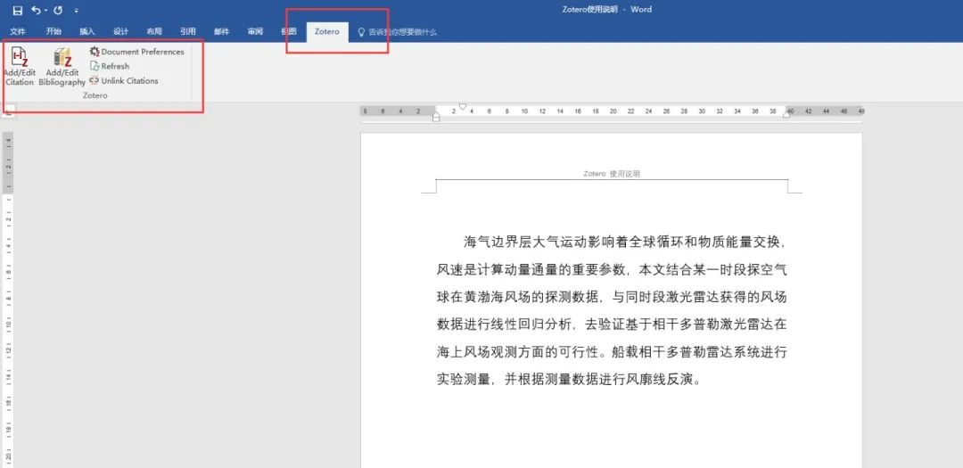 1. Word中点击菜单栏中的“Zotero”工具栏→选择要引用的方式(默认选项没有的引用方式参见第六部分)