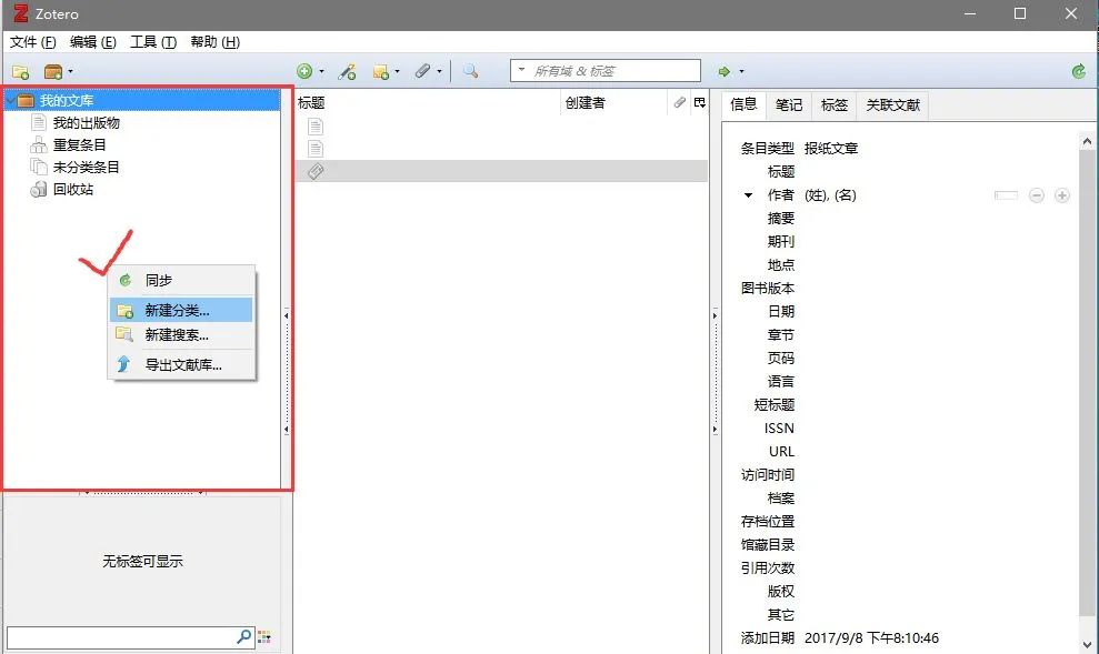 sudo apt-add-repository ppa:smathot/cogscinl # Say yes/press enter to accept any requests. $ sudo apt-get update # Wait for it to complete, then: $ sudo apt-get install zotero-standalone步骤:我的文库→右键→新建分类→输入名称→鼠标右键我的文库→出现新建文件夹
