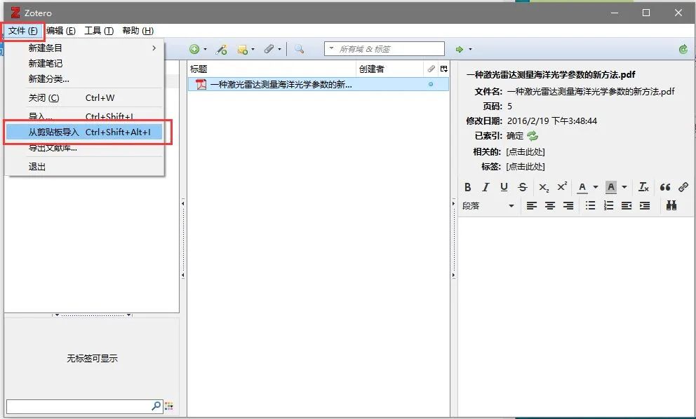 4. Zotero界面文件一栏→选择从剪贴板导入