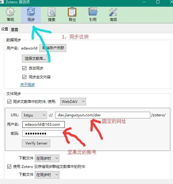 zotero只给了300m的空间,大概只能放80来篇文献的全文文件,如果文献较多就不能同步全文。注意:使用同步功能要先注册zotero账号。解决方法:使用坚果云: