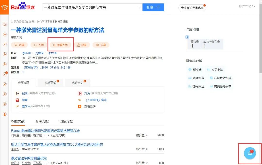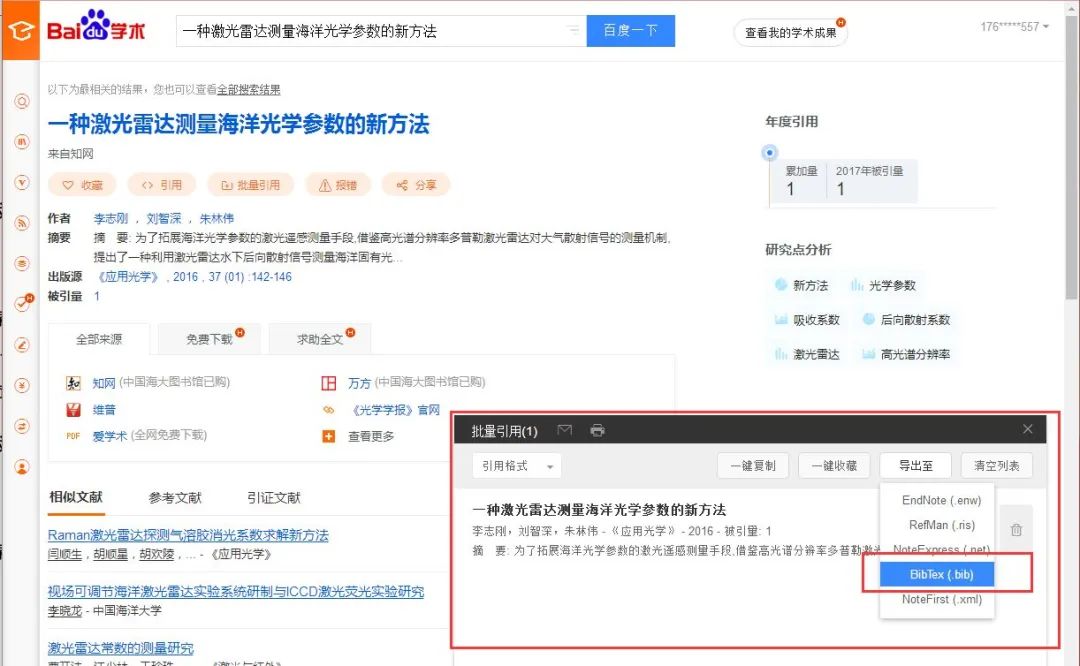 2. 在百度学术搜索文献→点击批量引用→导出到BibTex→下载