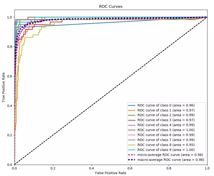 from sklearn.datasets import load_digits from sklearn.model_selection import train_test_split from sklearn.naive_bayes import GaussianNB X, y = load_digits(return_X_y=True) X_train, X_test, y_train, y_test = train_test_split(X, y, test_size=0.33) nb = GaussianNB() nb.fit(X_train, y_train) predicted_probas = nb.predict_proba(X_test) # The magic happens here import matplotlib.pyplot as plt import scikitplot as skplt skplt.metrics.plot_roc(y_test, predicted_probas) plt.show()效果如图(相当高大上!)