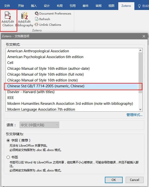 Citation工具→选择右下角管理样式→在 Zotero Style Repository对话框寻找想要的引文格式