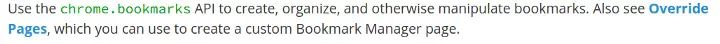 我发现我所需要的东西就在chrome.bookmarks API里面。结果我发现这是一个不常用的调用,很少扩展程序会用到它,这意味着网上也没有关于如何使用这个请求的教程。在这之前,我都是从精心制作的教程和指导手册学习知识,不需要花费太多精力。但这次,我只能通过阅读这个文档来学习。