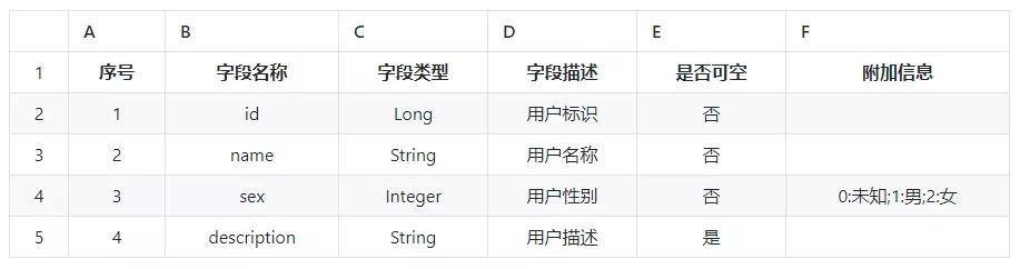 从 WIKI 上拷贝接口模型定义到 Excel 里,样例数据内容如下: