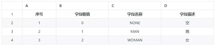 /** 用户DO类 */ public class UserDO { /** 用户标识 */ @NotNull private Long id; /** 用户名称 */ @NotBlank private String name; /** 用户性别(0:未知;1:男;2:女) */ @NotNull private Integer sex; /** 用户描述 */ private String description; ...... }2.利用 Excel 公式生成枚举类