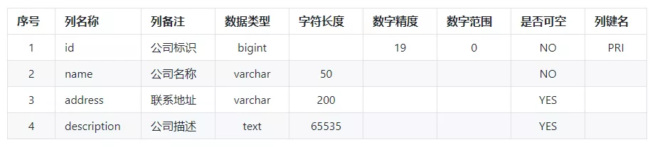select c.column_name as '列名称' , c.column_comment as '列备注' , c.data_type as '数据类型' , c.character_maximum_length as '字符长度' , c.numeric_precision as '数字精度' , c.numeric_scale as '数字范围' , c.column_default as '' , c.is_nullable as '是否可空' , c.column_key as '列键名' from information_schema.columns c where c.table_schema = ? and c.table_name = ? order by c.ordinal_position;其中,第1个问号赋值数据库名称,第2个问号赋值表名称。