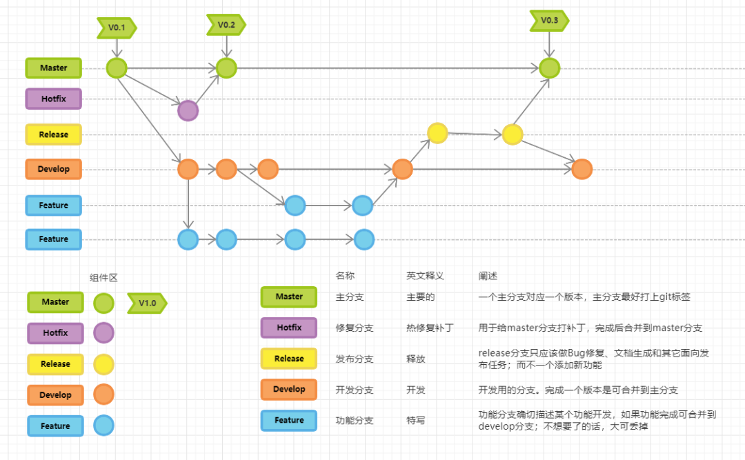 对于团队而言,gitflow 是一个很不错的开发流程。可以很大程度上管理好我们的分支代码,避免团队的人由于误操作而导致某个重要分支出现问题。下面贴出gitflow 流程图,对于其具体内容同样不会介绍太多,感兴趣小伙伴去百度吧