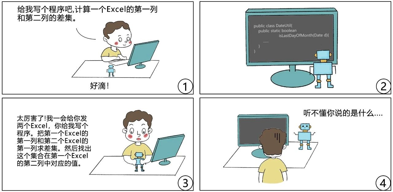 图2:AI 编程现状以图2漫画(改编自[3])为例,当用户提出的需求相对简单,且这个 AI 编程机器人可以在某个大代码库中找到能够实现这一需求的程序时,效果通常是不错的。但是如果用户提出的需求相对复杂,要求 AI 编程机器人具有一定的推理能力(所需的程序在已知代码库中并不存在,需要对一些已有的程序片段进行复合生成),在这种情况下的效果通常是比较糟糕的。