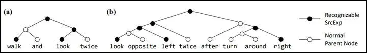 图8:LANE 在 SCAN 的各个子任务上均达到100%的准确度图9展示了 LANE 中的 Composer (TreeLSTM)学习得到的两个隐式树结构作为示例。TreeLSTM 在具体实现时是二叉化的,将具体进行抽象动作的结点着黑色。可以看到,即使并未引入任意人工预定义的抽象/映射规则,LANE 也能够自动化地探索出符合人类思维的抽象化过程。