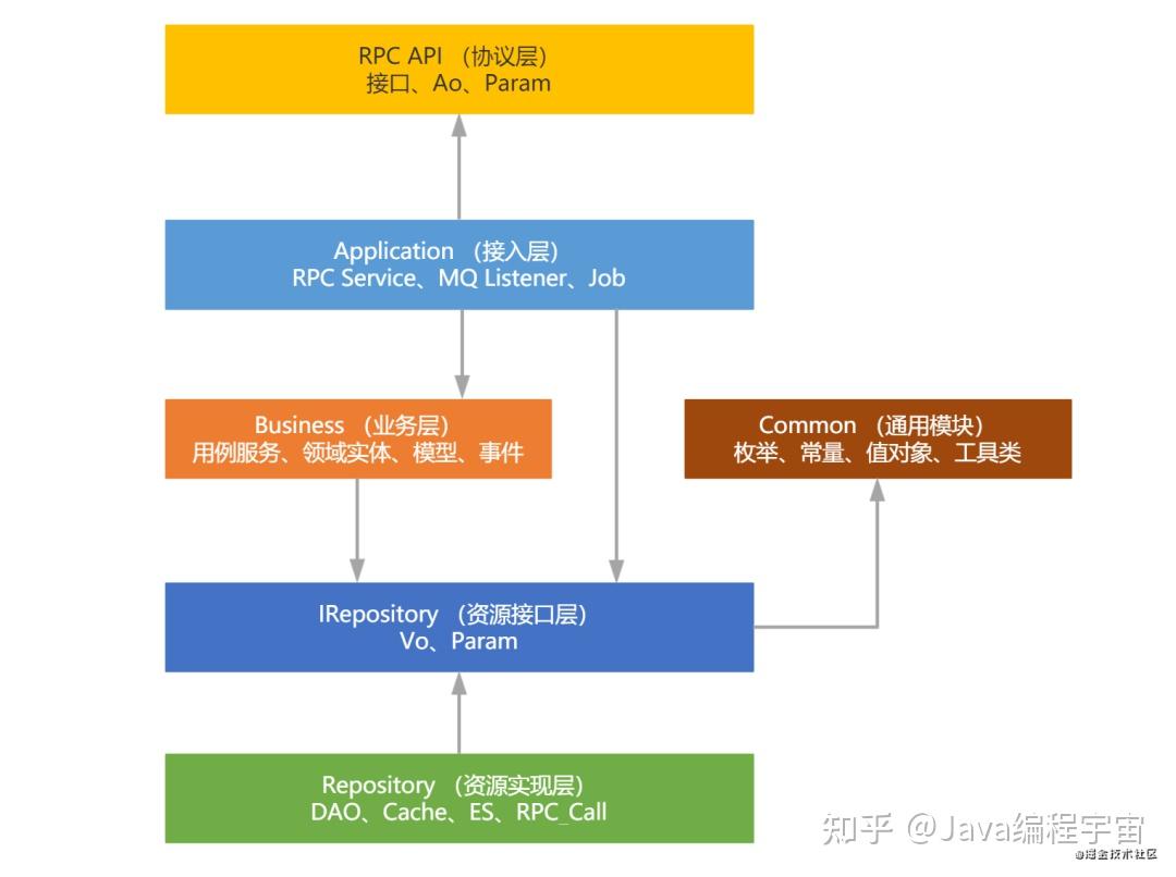 server_main:配置层,负责整个项目的module管理,maven配置管理、资源管理等;server_application:应用接入层,承接外部流量入口,例如:RPC接口实现、消息处理、定时任务等;不要在此包含业务逻辑;server_biz:核心业务层,用例服务、领域实体、领域事件等server_irepository:资源接口层,负责资源接口的暴露server_repository:资源层,负责资源的proxy访问,统一外部资源访问,隔离变化。注意:这里强调的是弱业务性,强数据性;server_common:公共层,vo、工具等代码开发要遵守各层的规范,并注意层级之间的依赖关系。