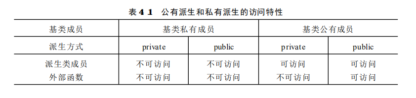 无论哪种派生方式, 基类中的私有成员既不允许外部函数访问, 也不允许派生类中的成员函数访问,但是可以通过基类提供的公有成员函数访问。公有派生与私有派生的不同点在于基类中的公有成员在派生类中的访问属性。公有派生时, 基类中的所有公有成员在派生类中也都是公有的。