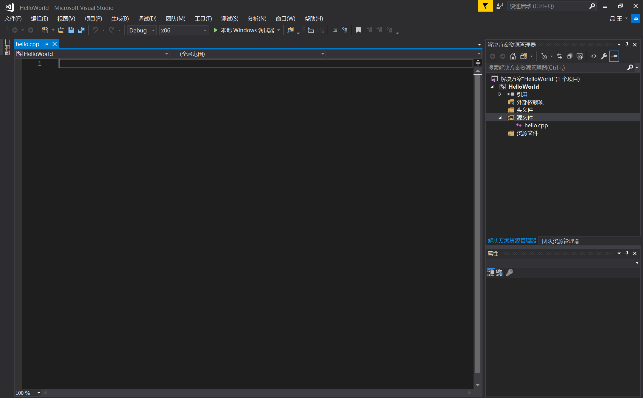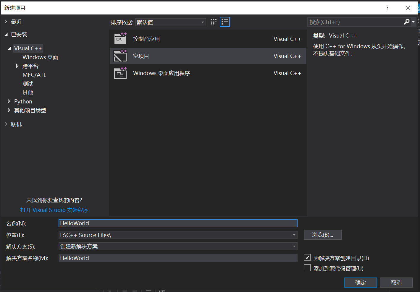 首先,需要安装C++语言环境,这里选择了Visual Studio 2017。作为一个从未使用过C++的小白,我打开Visual Studio之后居然不知道怎么开始写程序,百度之后开始写了第一个程序Hello World,过程记录如下: