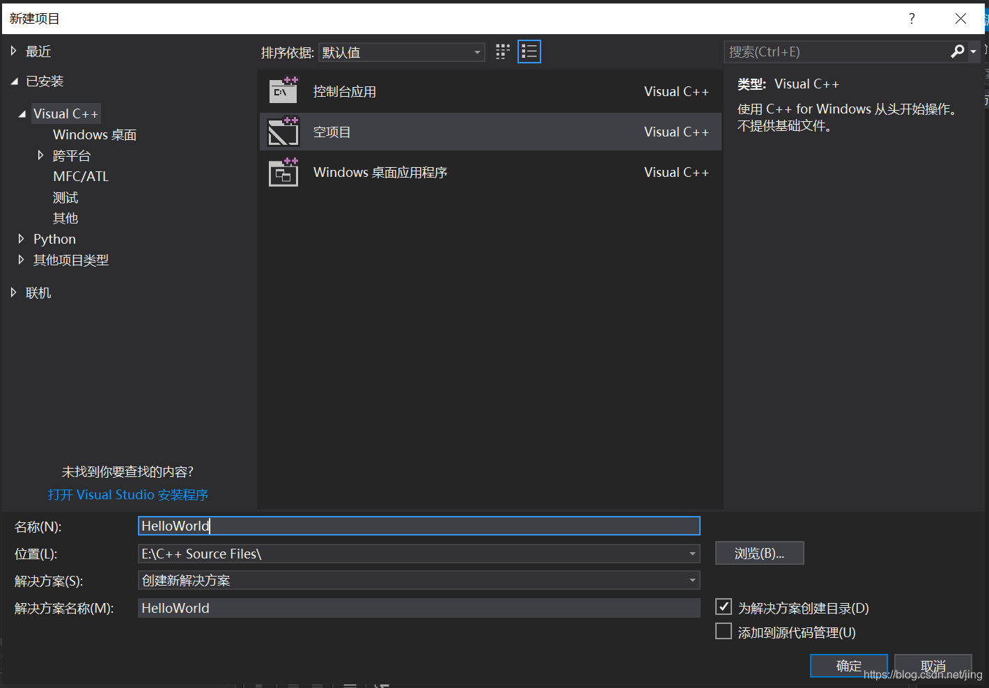 打开Visual Studio 2017,点击菜单栏:文件–>新建–>项目,左边栏选择Visual C++,中间选择空项目,然后设置项目名称和保存路径,这里项目名称为HelloWorld。