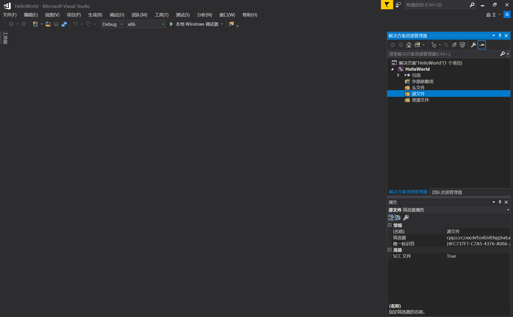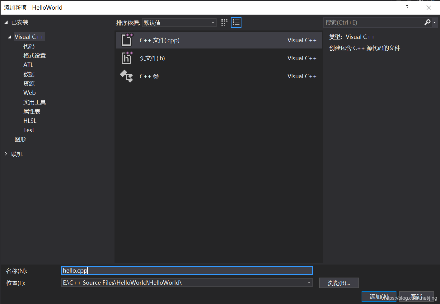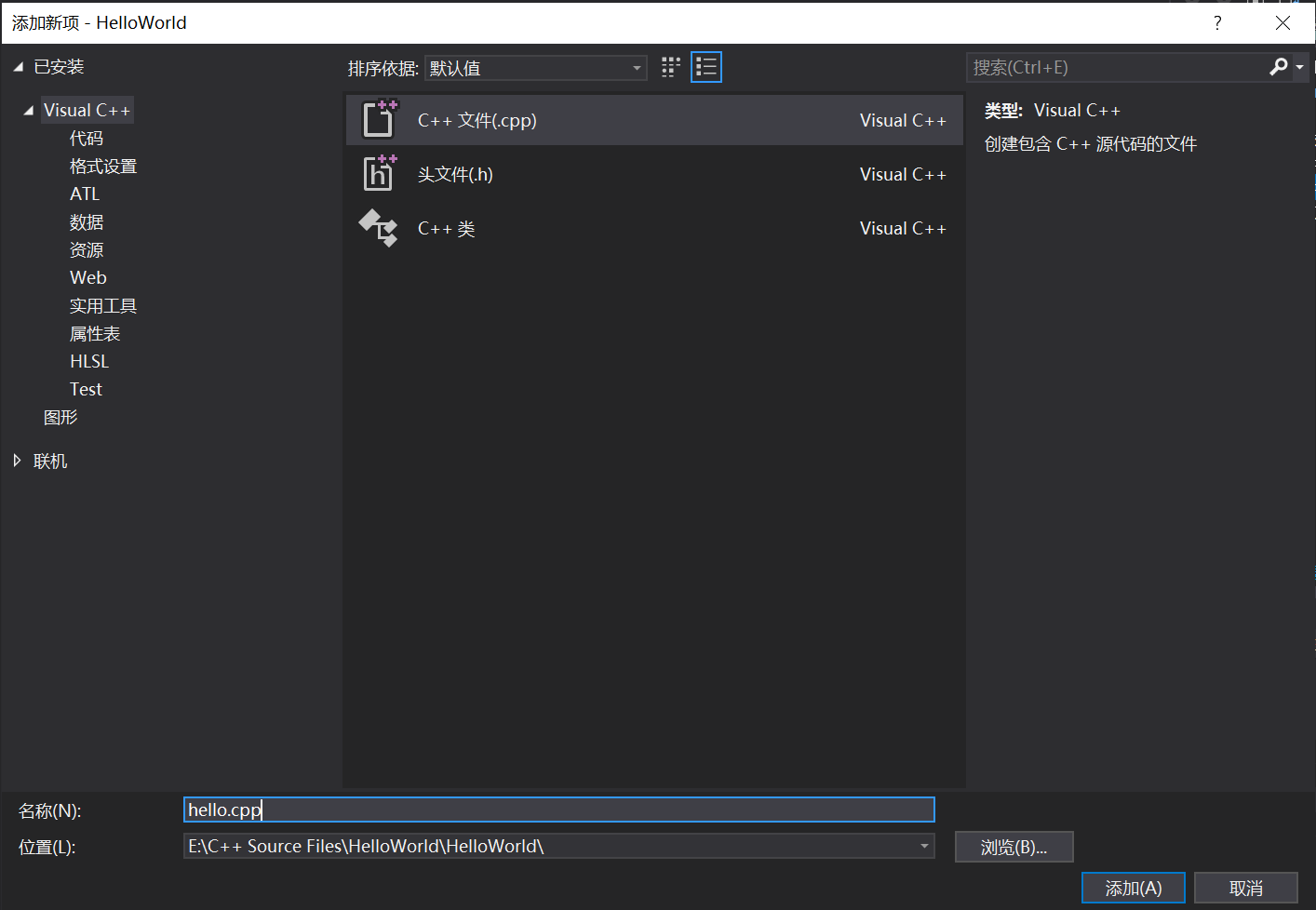 右键点击右边栏HelloWorld工程下的“源文件”,点击 添加–新建项,设置文件名称,这里命名为hello.cpp。