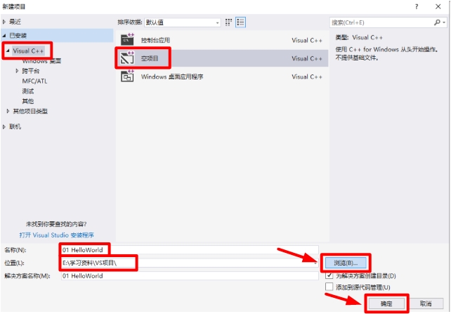 step2:选择Visual C++,然后选择空项目,接着修改项目名称,点击浏览修改项目位置,最后点击确定,项目创建完成。