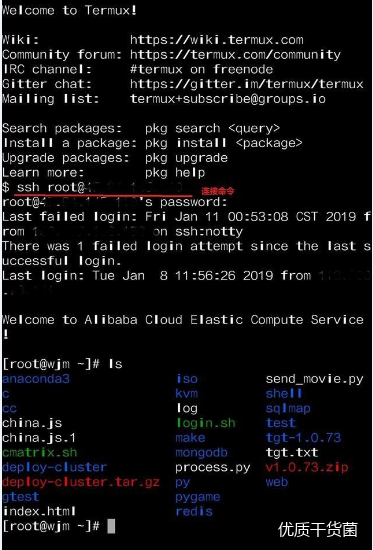 安装ssh后,可以直接在手机上远程登录Linux服务器,如下:
