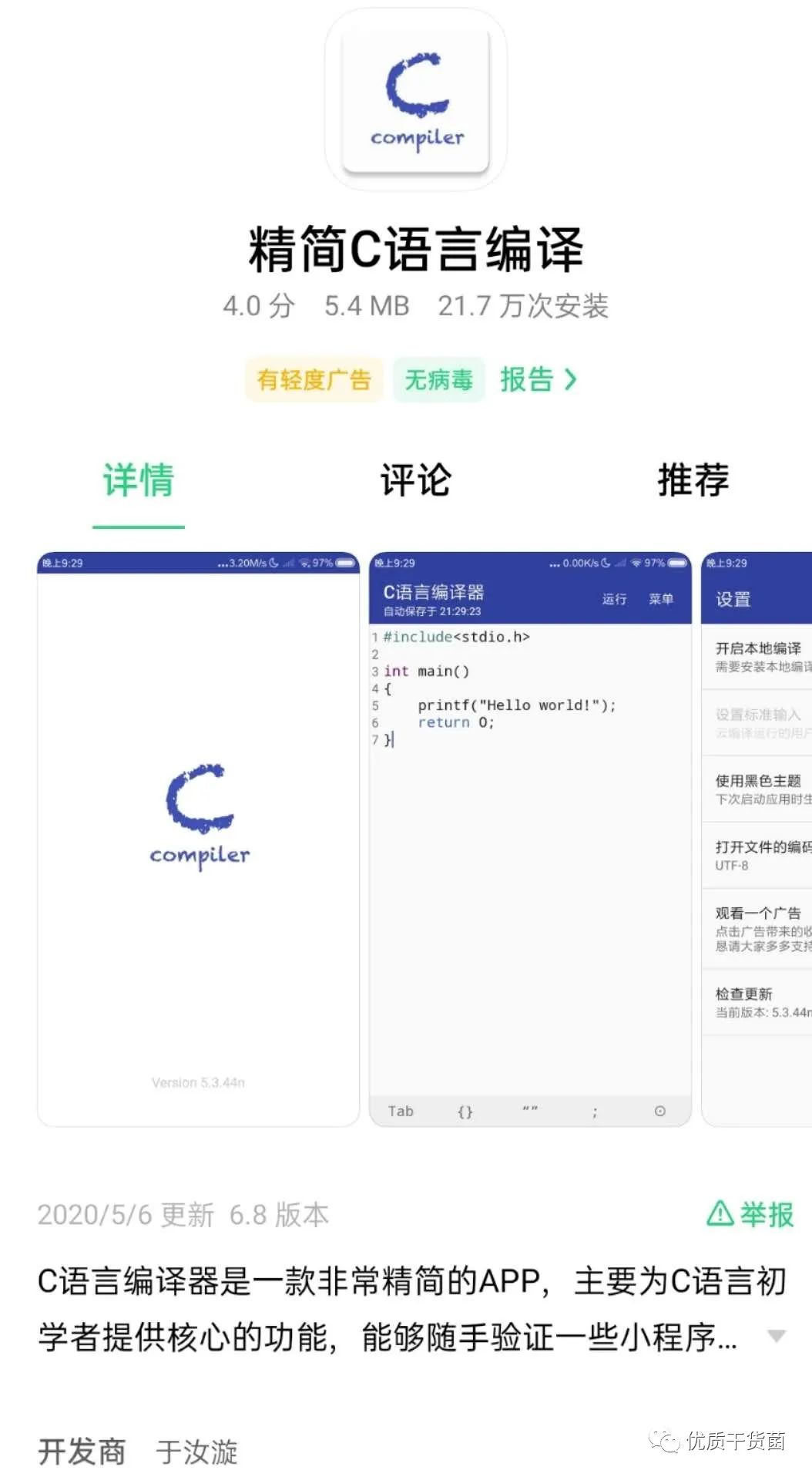 安装精简C语言编译,这个直接在手机应用中搜索就行,如下,大概也就5兆多,直接点击下载安装就行
