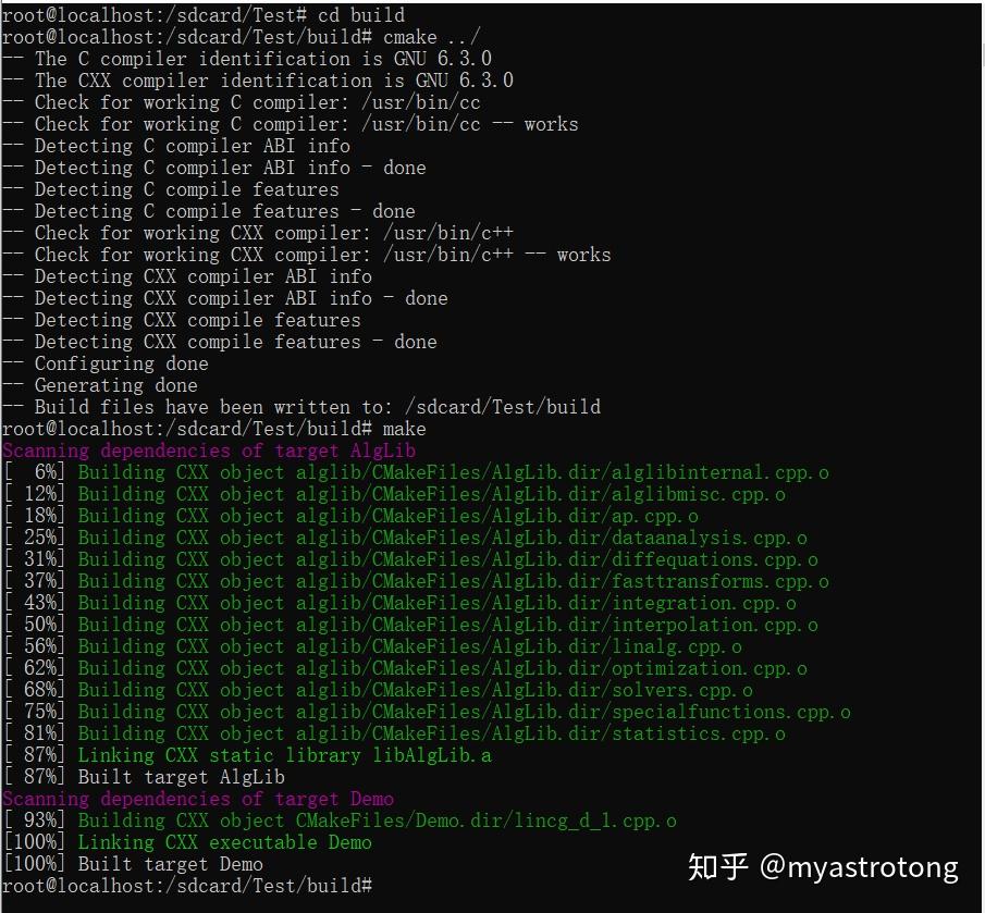 # CMake 最低版本号要求 cmake_minimum_required (VERSION 2.8) # 项目信息 project (Demo1) set(CMAKE_INCLUDE_CURRENT_DIR ON) include_directories ("${PROJECT_SOURCE_DIR}/alglib") # 查找当前目录下的所有源文件并将名称保存到 DIR_SRCS 变量 aux_source_directory(. DIR_SRCS) add_subdirectory (alglib) # 指定生成目标 add_executable (Demo ${DIR_SRCS}) target_link_libraries (Demo AlgLib)以上文件用于生成可执行文件Demo,而且是基于alglib目录下的libAlgLib.a静态链接库,并给出了头文件的目录。由于Linux的规定,你只需要输入AlgLib就够了,系统会自动不全静态链接库的文件名。