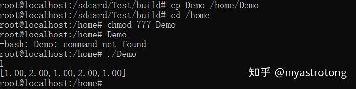 你可能发现我是在sdcard目录制作的,这实际是安卓手机自带的目录,在这个目录下制作的可执行文件是不具有可执行权限的,因此把它拷贝到系统的/home文件夹下,然后修改为具有可执行权限,指令如下: