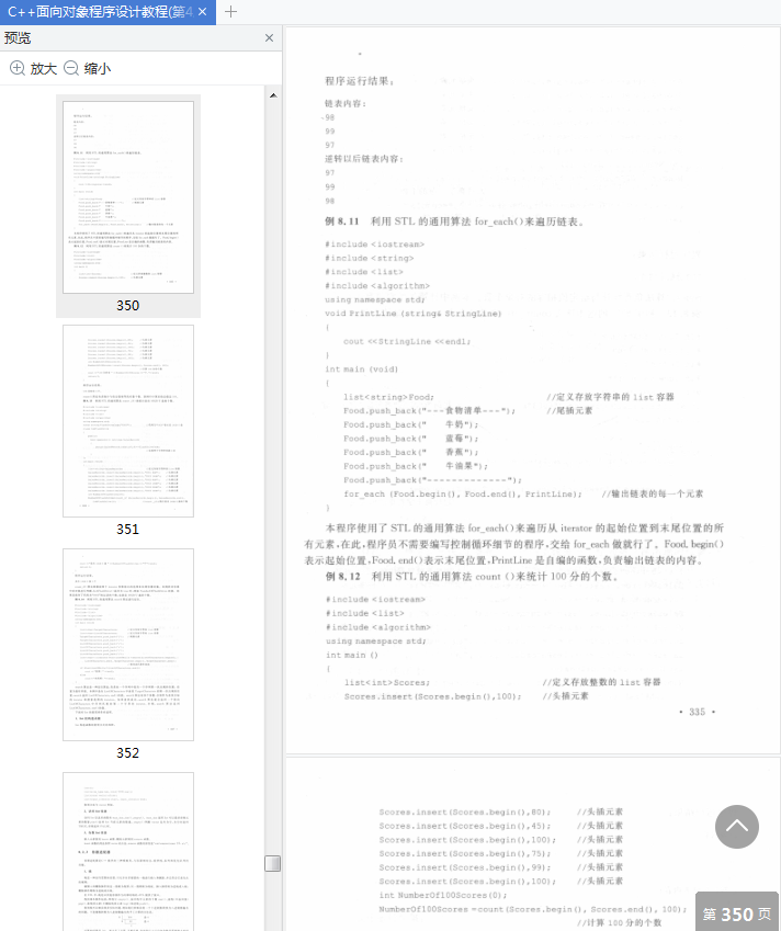(2)增加了“STL标准模板库”一章,对于有一定程序设计基础的读者来说,掌握这部分内容可以提高编程效率,因为标准模板库中提供了对常用数据结构的操作,如表、栈和队列等。程序设计者在编写实用程序时可以直接调用在这些数据结构上操作的函数,而不用再编写相关的基础程序了。当然,作者也要强调,在学习过程中,数据结构的基础程序还是需要学习者好好研究并自己编写的,只是,在已经掌握了相关内容后,在编写实用程序的时候,可以考虑使用标准模板库。