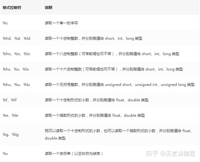 可以通过 sizeof 关键字来获取数据类型占用内存的大小。上面代码可以看到了打印中出现了很多不识的 scanf() 格式控制符,我总结了一个表,可以参考下;