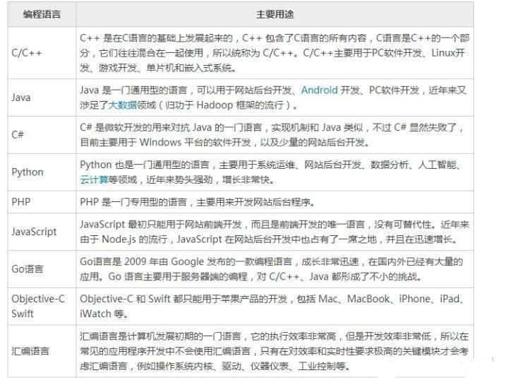 编程语言有很多种,常用的有C语言、C++、Java、C#、Python、PHP、JavaScript、Go语言、Objective-C、Swift、汇编语言等,每种语言都有自己擅长的方面,例如: