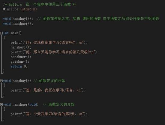 例如,在本程序中,你可以把 hanshuyi()函数定义在 main()函数的前面,程序的执行不会改变,hanshuyi()函数仍是在两次 printf()调用之间执行的。记住,所有的 C语言程序都是从 main()函数开始执行的,main函数也称之为入口函数,不管它在程序文件中处于什么位置。