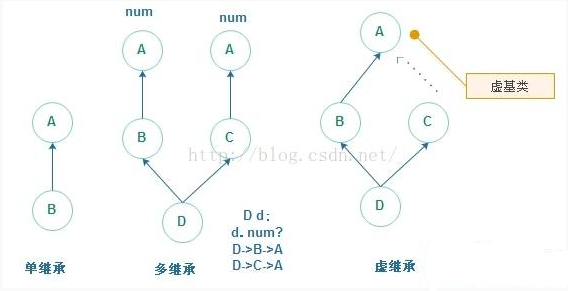 (7)虚继承:主要解决在多继承中,访问不明确的问题。虚继承中所有的子类都指向同一份数据空间。