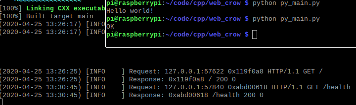 int main() { crow::SimpleApp app; CROW_ROUTE(app, "/")([](){ return "Hello world!"; }); CROW_ROUTE(app, "/health")([](){ return "OK"; }); app.port(8888).multithreaded().run(); return 0; }Python端的发送消息的代码如下: