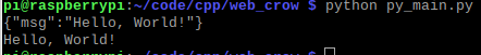 CROW_ROUTE(app, "/json") ([]{ crow::json::wvalue x; x["msg"] = "Hello, World!"; return x; });Python端的发送消息的代码如下: