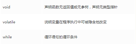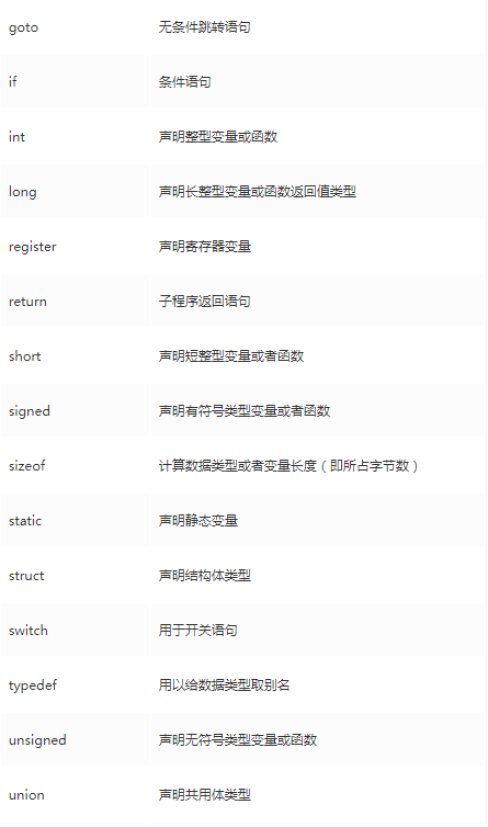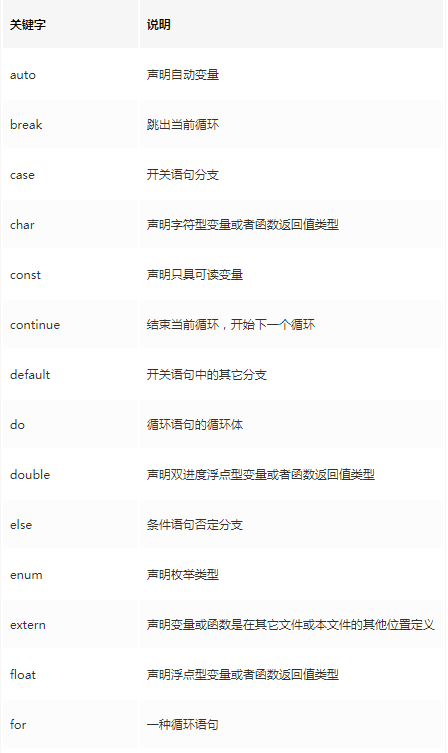 下面我们来看一下 C 中的关键字,这些关键字不能作为常量名,变量名或者其它标识符名称(跟 Java 类似)。