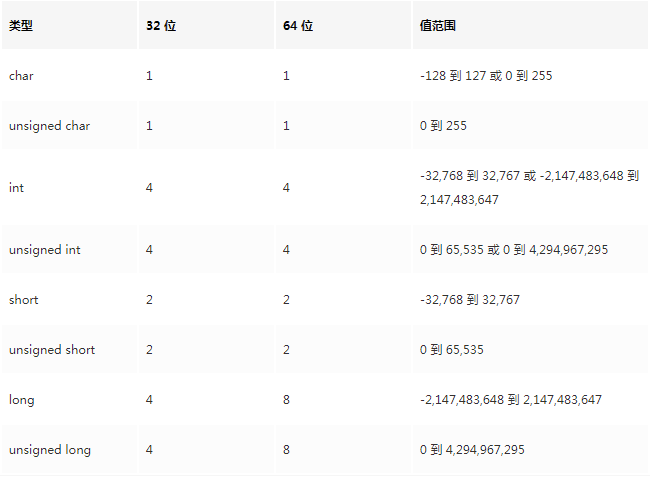 下表列出了关于标准整数类型的存储大小和值范围的细节