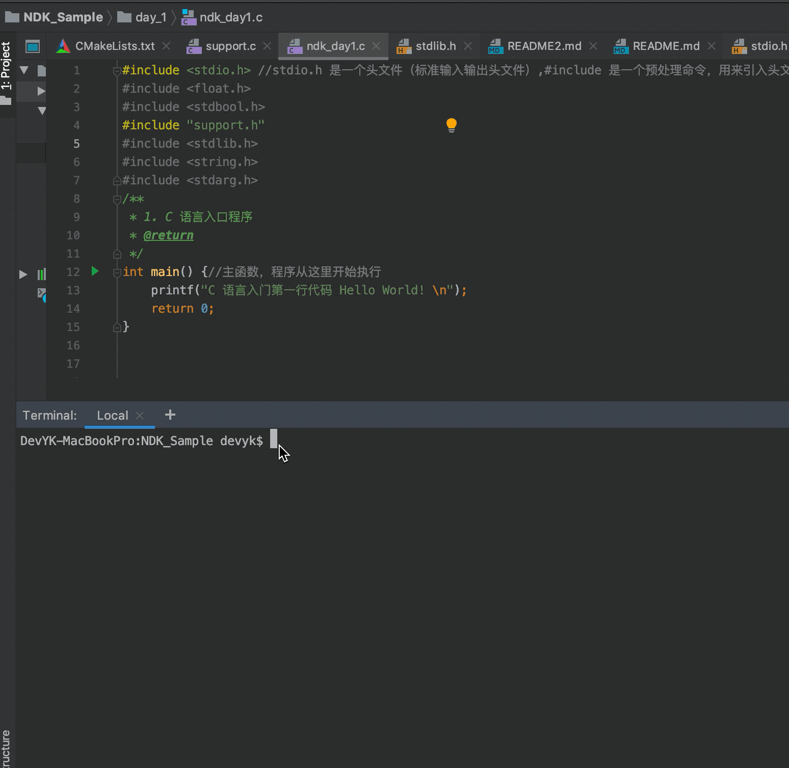 这是只说明在 MAC 上怎么使用 C 语言来进行开发,环境的话需要用到 GCC 进行编译,你可以下载并安装 Xcode 工具,一旦安装上 Xcode,您就能使用 GNU 编译器。开发工具你可以使用 Xcode 或者 CLion 都可以,看个人喜好。我这里用的是 CLion 工具,你可以发现 CLion 页面跟使用风格包括快捷键都跟 AndroidStudio 一样。上手极其容易。
