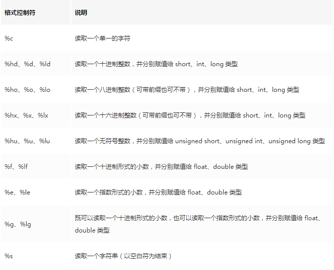 可以通过 sizeof 关键字来获取数据类型占用内存的大小。上面代码可以看到了打印中出现了很多不识的 scanf() 格式控制符,我总结了一个表,可以参考下;