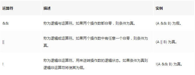 下表显示了 C 语言支持的所有关系逻辑运算符。假设变量 A 的值为 1,变量 B 的值为 0,则: