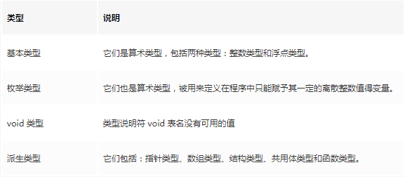 在 C 语言中,数据类型指的是用于声明不同类型的变量或函数的一个广泛的系统。变量的类型决定了变量存储占用的空间,以及如何解释存储的位模式。