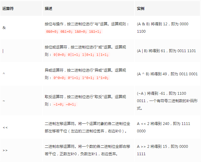 下表显示了 C 语言支持的位运算符。假设变量 A 的值为 60,变量 B 的值为 13,则: