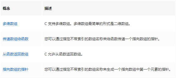 在 C 中,数组是非常重要的,我们需要了解更多有关数组的细节。下面列出了 C 程序员必须清楚的一些与数组相关的重要概念: