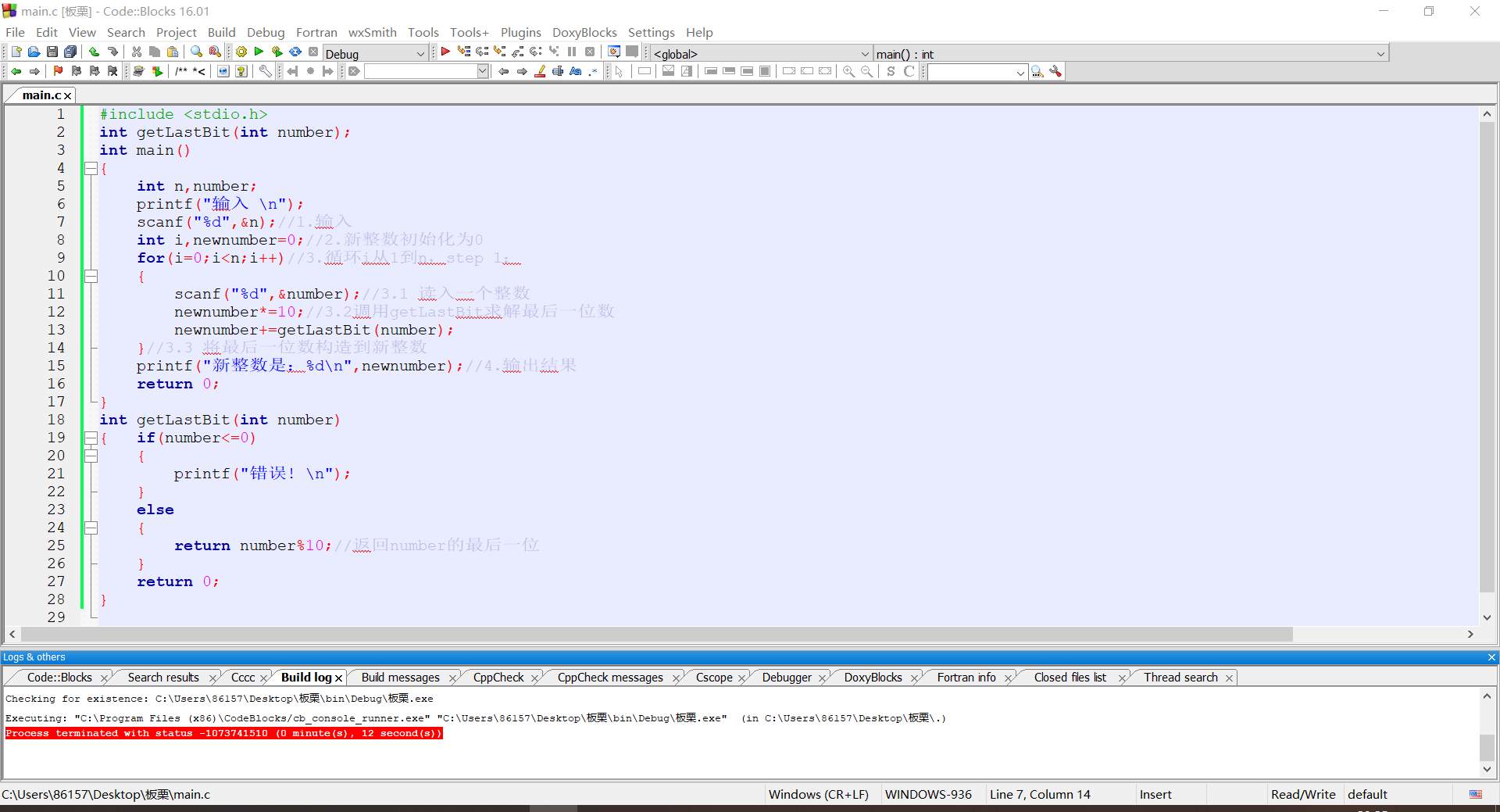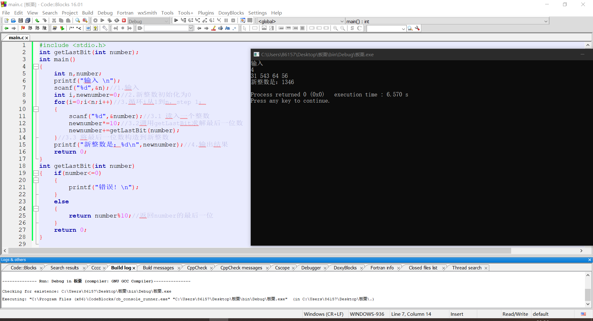 新建文件sy3-2.c,编写函数int getLastBit(int number),该函数返回正整数number的个位数,例如正整数1234,则返回4。在main函数中实现输入n个任意整数,取n个数的最后一位构成一个新的整数后输出。例如依次输入4个数(45、81、673、938),得到的新的整数为:5138。根据以下代码片段及注释部分完成程序。