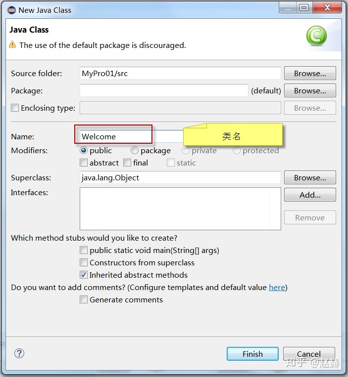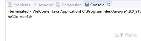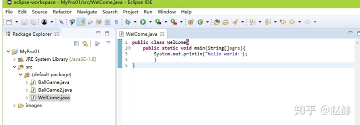 点击Finish后,新建Java类成功,在src下面出现了Welcome.java文件。点击该文件后,出现该文件的代码编辑,