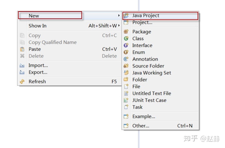 在界面左侧的“Package Explorer”视图中右键单击,在快捷菜单中依次选择new——> Java Project,开始新建Java项目。