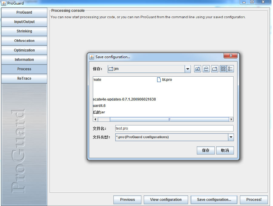点击第一个选项“Proguard”,再点击“Load configuration”,选择我们刚才保存的“test.pro”进行加载。