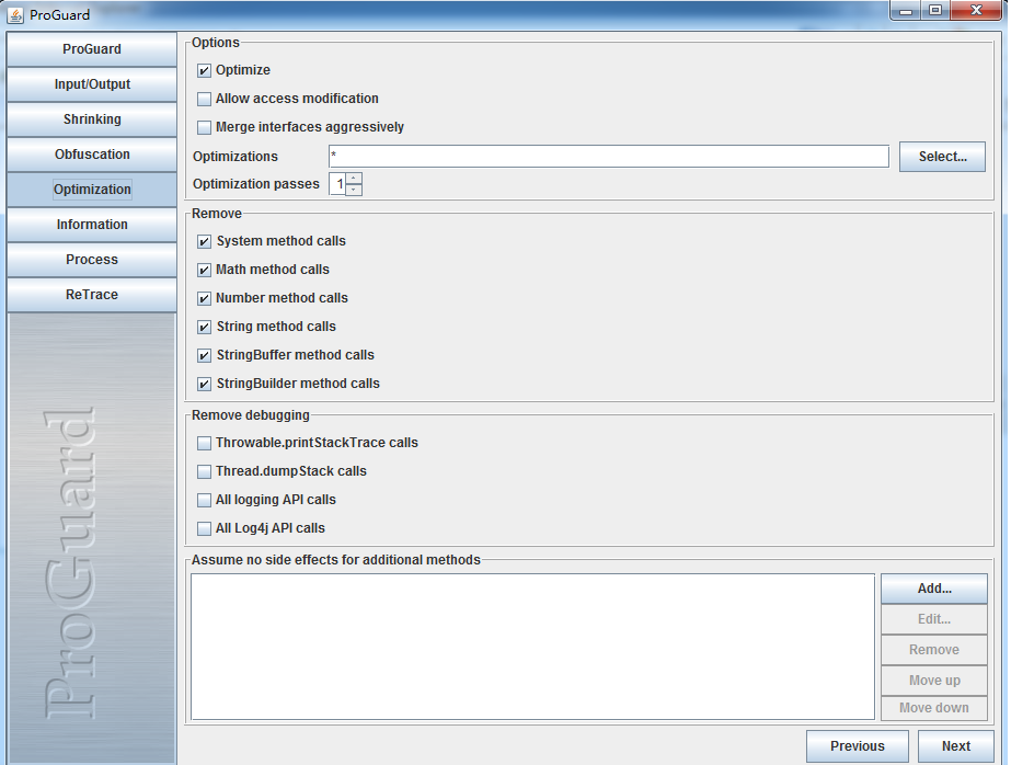 一个压缩、优化和混淆Java字节码文件的免费的工具,它可以删除无用的类、字段、方法和属性。可以删除没用的注释,最大限度地优化字节码文件。它还可以使用简短的无意义的名称来重命名已经存在的类、字段、方法和属性。常常用于Android开发用于混淆最终的项目,增加项目被反编译的难度。