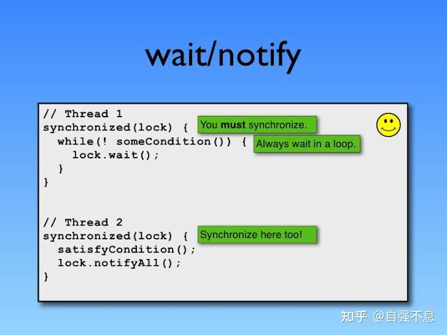 另一个有难度的 Java 问题,wait 和 notify。它们是在有 synchronized 标记的方法或 synchronized 块中调用的,因为 wait 和 nodify 需要监视对其调用的 Object。
