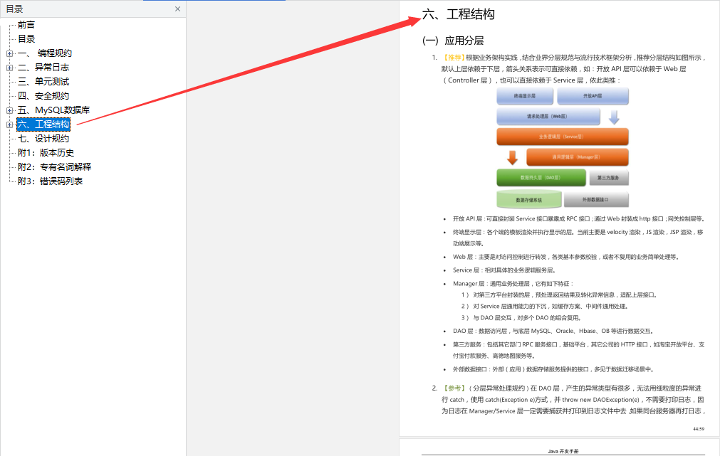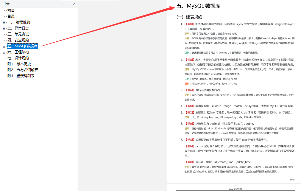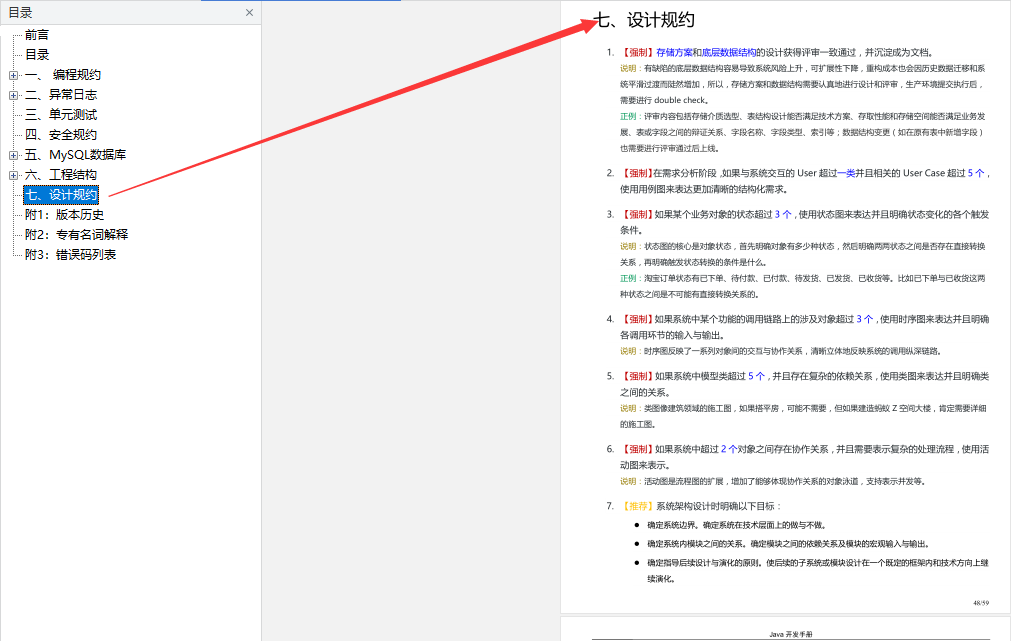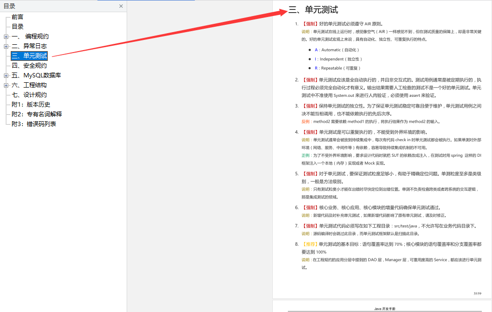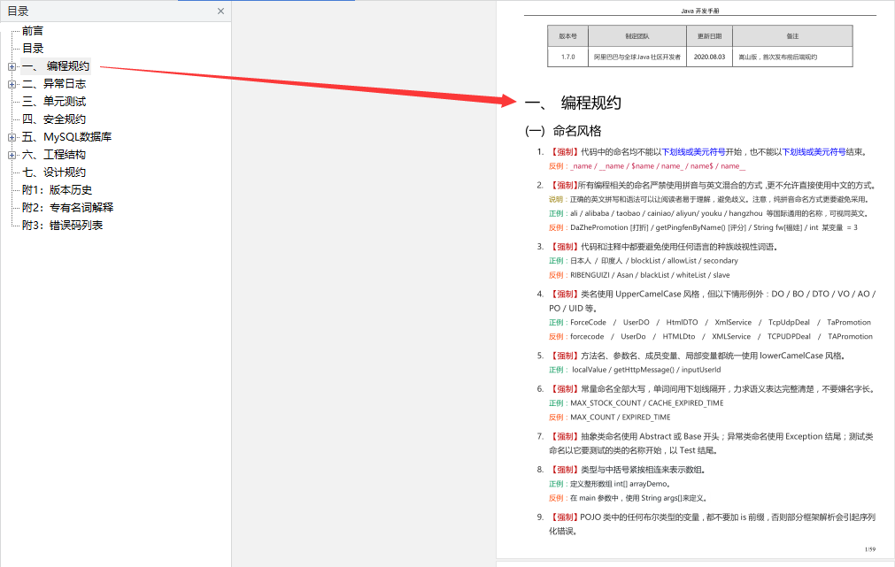所以本手册以 Java 开发者为中心视角,划分为编程规约、异常日志、单元测试、安全规约、MySQL 数据库、工程结构、设计规约七个维度,再根据内容特征,细分成若干二级子目录。另外,依据约束力强弱及故障敏感性,规约依次分为【强制】、【推荐】、【参考】三大类。在延伸信息中,“说明”对规约做了适当扩展和解释;“正例”提倡什么样的编码和实现方式;“反例”说明需要提防的雷区,以及真实的错误案例。