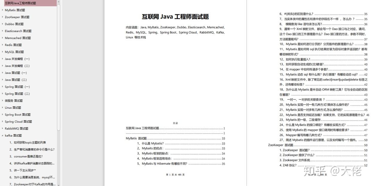 小编整理出一份《Java工程师2020必备的面试宝典》,同时也是学习进阶的不二之选,篇章也是包括了很多知识点,其中包括了有Java基础知识、MyBatis、ZooKeeper、Dubbo、Elasticsearch、Memcached、 Redis、Netty、RPC、MySQL、Spring、Spring Boot、Spring Cloud、RabbitMQ、Kafka、Linux、算法与数据结构等等;由于篇幅有限,这里以图片的形式给大家展示一部分。