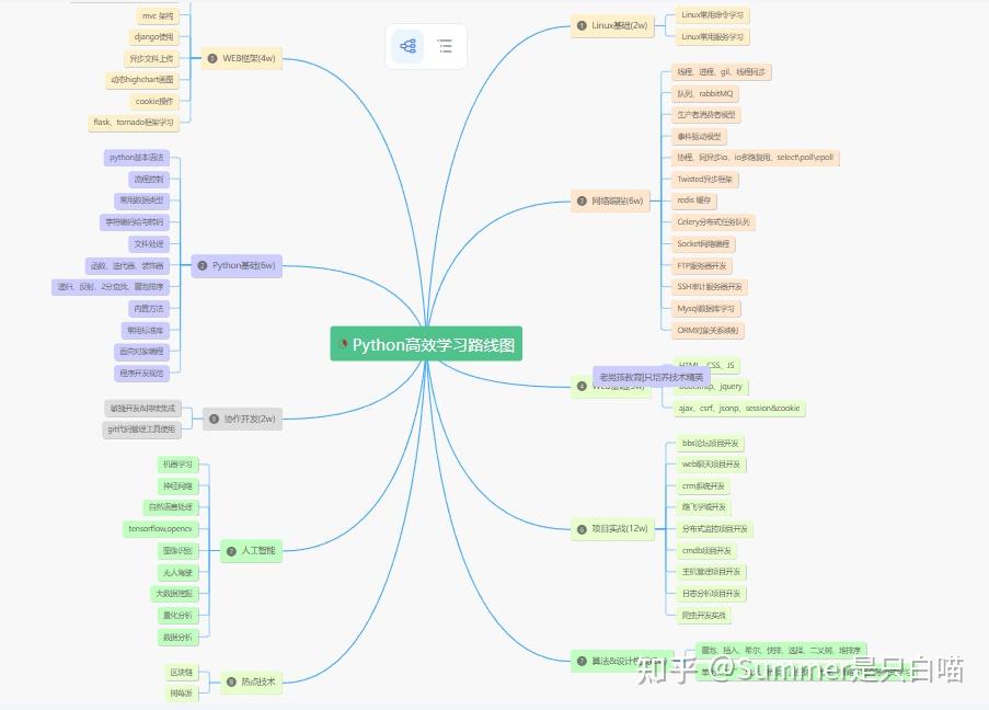 python学习路线图首先,对于没有学习方向,知识不体系的人,我把我工作几年整理的学习路线分享给大家,做一个借鉴作用,还不知道怎么学习的人可以直接照着我这个学习路线一个个的去学习,知识不体系的人可以参考下我整理路线的方式,总之希望能够帮到你们!